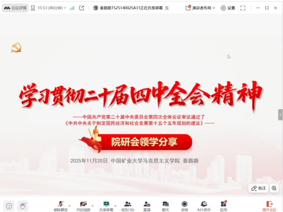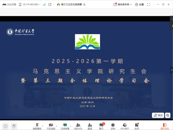 为提升研会成员的理论素养,推进研会各部门工作有序展开,2025年11月20日晚,第十五届马克思主义学院研究生会召开第三次线上例会暨第三期理论学习会。本次会议由娄嘉琦主持,全体研会成员参与会议。