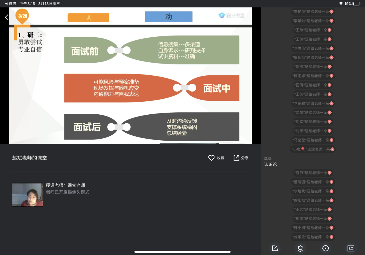 2019级马理论硕士李新同学说:“赵斌老师的线上辅导课非常有意义,赵老师从“谋”和“动”两方面出发,结合马克思主义理论专业,为我们解答了在学习、求职、升学等各方面的疑惑,也让我对今后确定生涯目标、就业方向有了更加清晰的认识。研一阶段,要踏实学好理论知识、提高写作能力,不断丰富自己,为就业早做准备,同时要有“初生牛犊不怕虎”的精神,对未来充满希望。”
