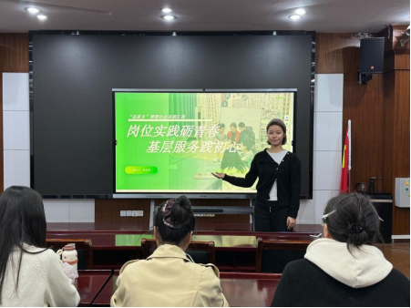 杨金瑾以 《岗位实践砺青春,基层服务践初心》 为题,分享了她深入基层岗位进行实习锻炼的经历。她从初到岗位的紧张生涩,到逐渐熟悉业务、服务群众的从容应对,生动展现了在基层实践中磨砺意志、增长才干的蜕变过程。她表示,基层是最好的课堂,实践是最好的老师,未来将继续在服务奉献中实现人生价值。